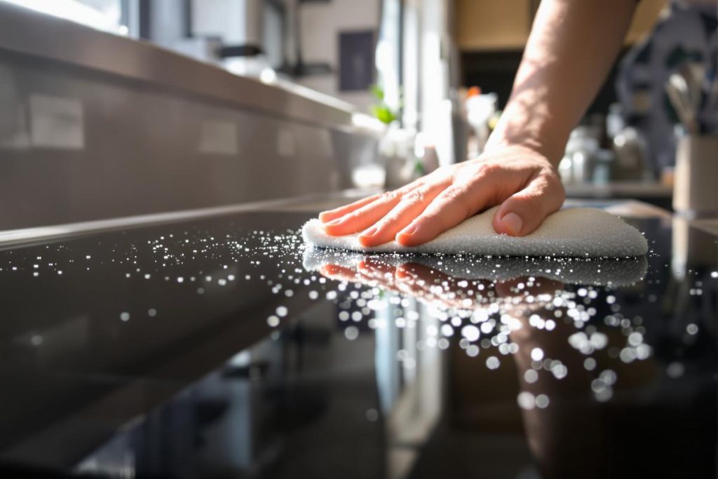 Le mot-clé trace sous verre plaque induction décrit bien le problème : agir avec méthode évite d’aggraver l’état. Commencez toujours par laisser refroidir la plaque, puis retirez les résidus friables avec un chiffon sec. Voici cinq méthodes adaptées selon la nature des taches.